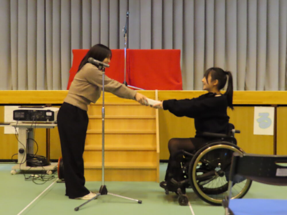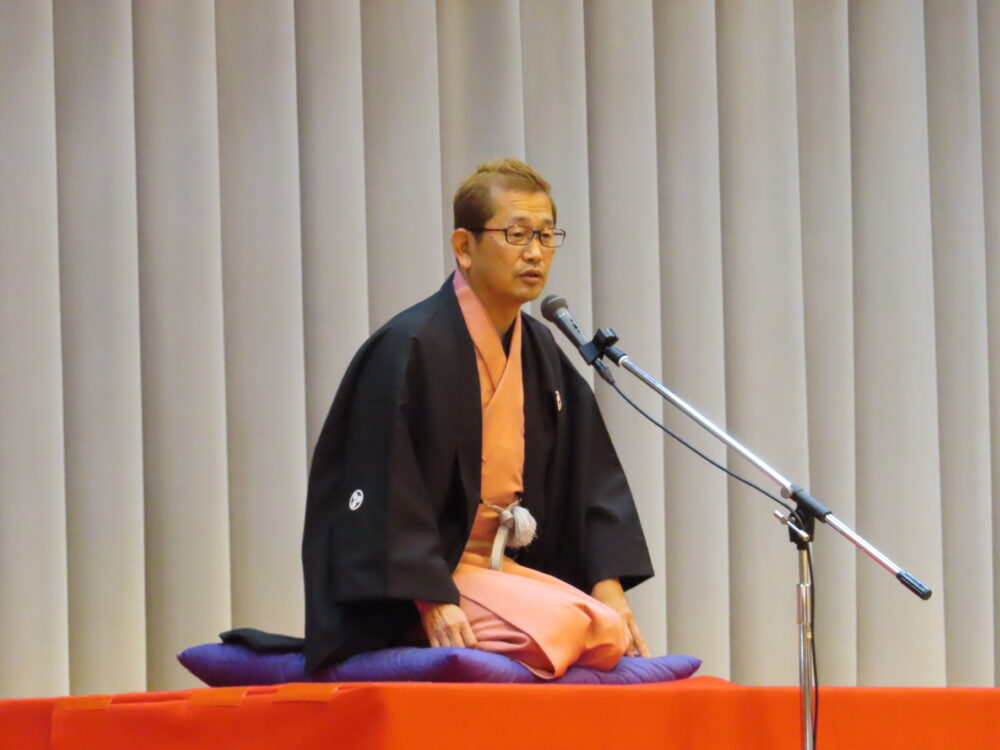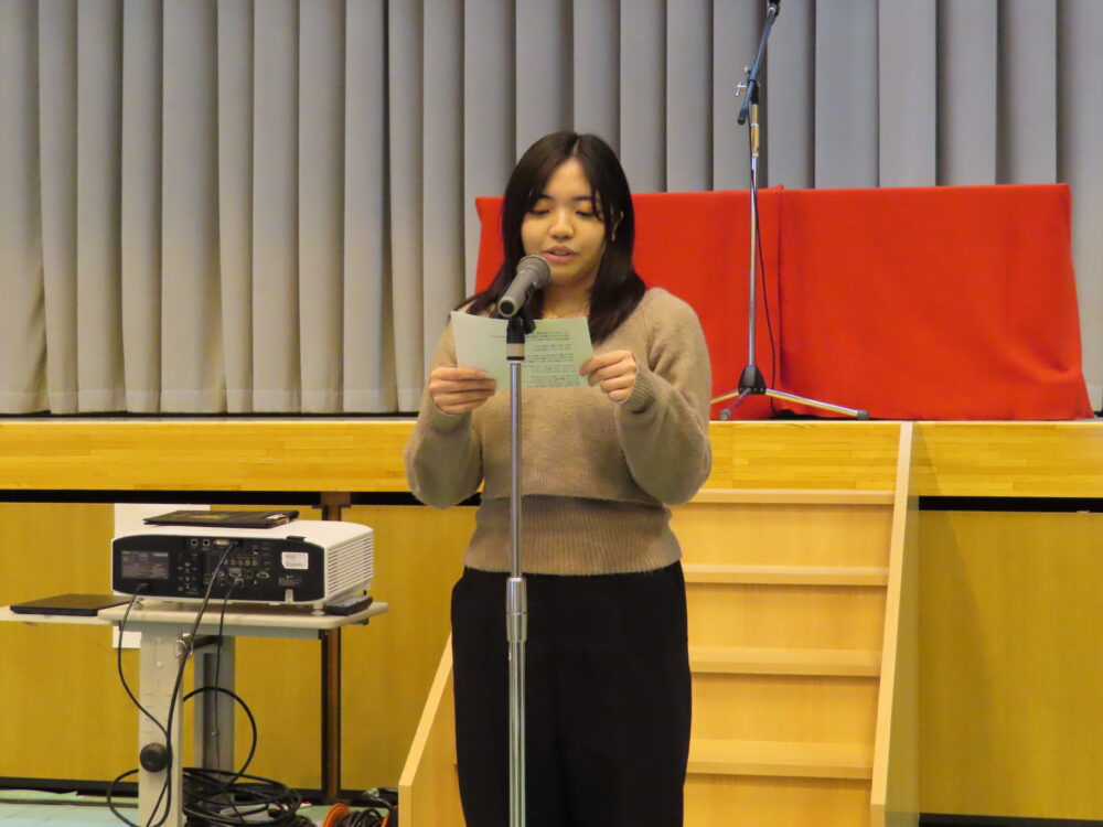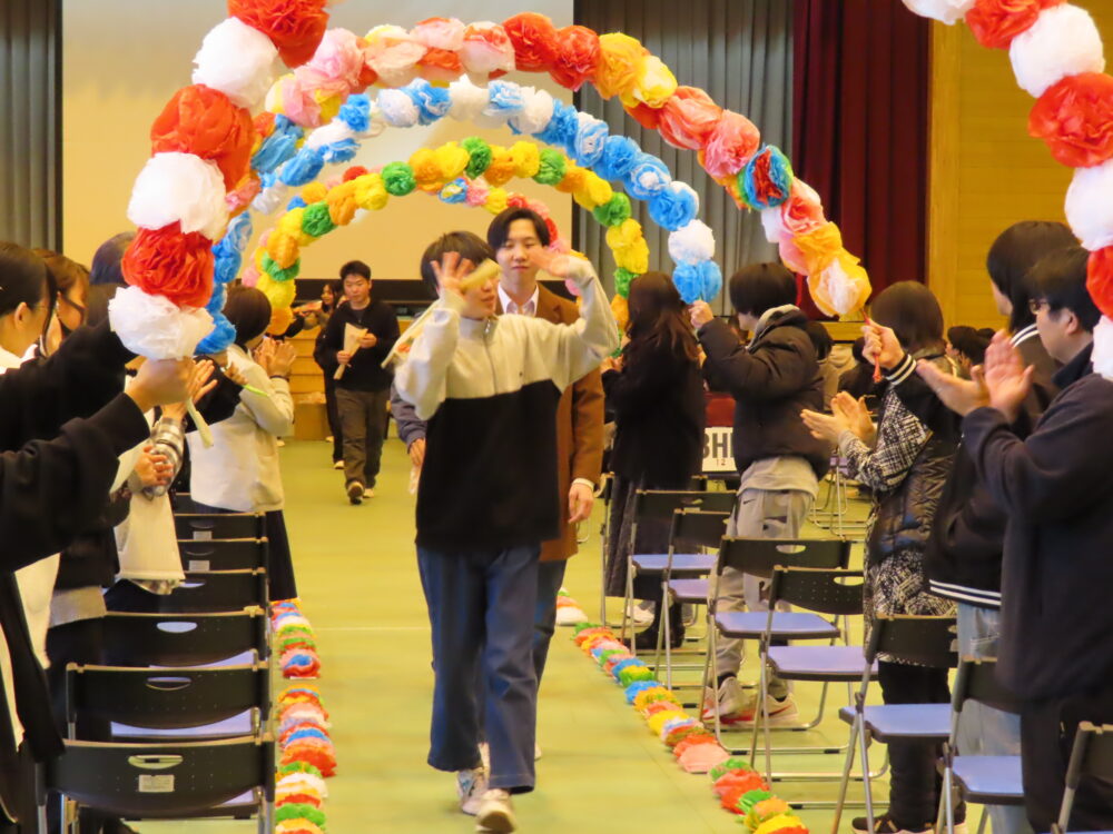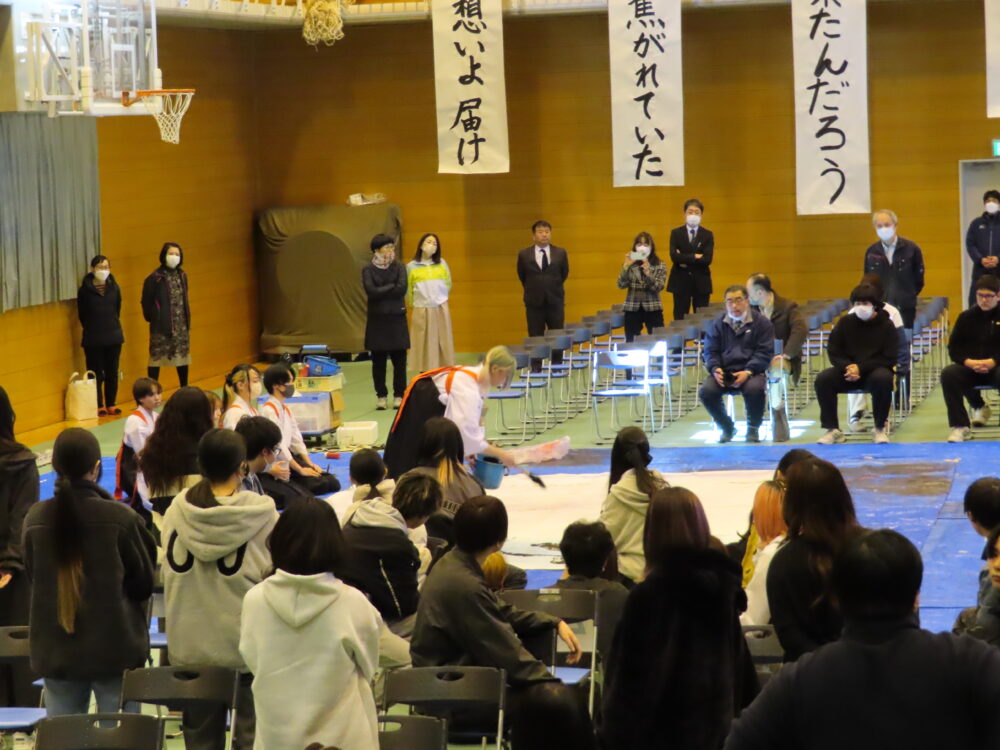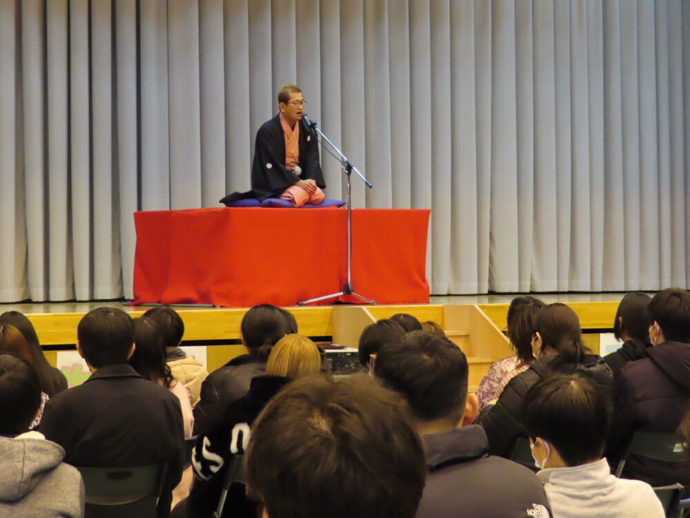 3部合同で「卒業生を送る会」が行われました。音楽の授業選択者による演奏で卒業生が入場し、書道パフォーマンスで会を盛り上げてくれました。また、特別ゲストとして三枝亭二郎さんをお招きし落語を鑑賞しました。新生徒会長から卒業生にお祝いの言葉が贈られ、卒業生の新しい一歩をみんなで心からお祝いする温かい会となりました。